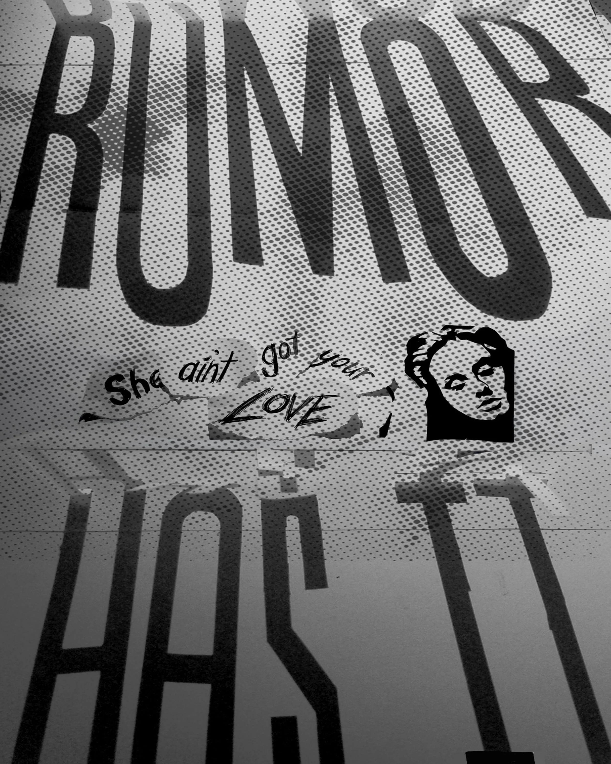 Inspired by Adele’s Rumour Has It. “Rumor Has It” is formed through shadows. In contrast, “she ain’t got your love anymore” is constructed from ripped paper.